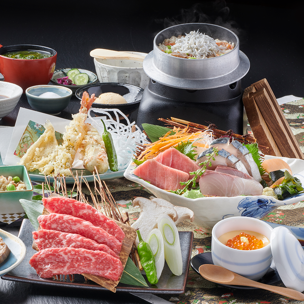 楽しい宴の一時を演出するお料理は、熱海の名産品や、旬の食材を厳選した、こだわりのお膳にしております。お膳は会席、お刺身、釜めしなど、お好みでお選びいただけます。