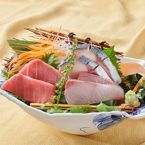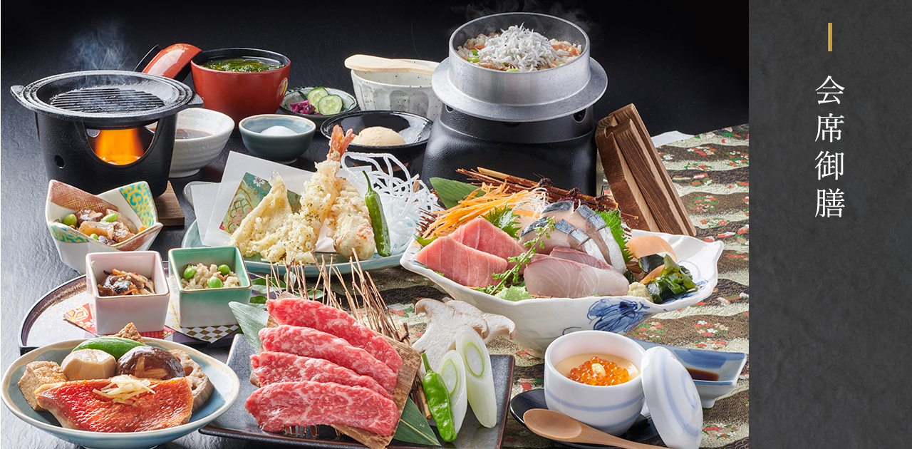 地元の名産をふんだんに使用し、贅を尽くした和食のコース料理。旬のお刺身から煮付け等、彩を楽しみ味で堪能する。熱海に来たら是非ともご賞味ください。
