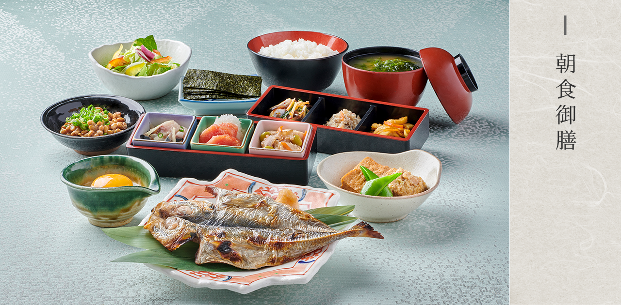 13品目のボリューム満点のご朝食でございます。焼きたてのアジの干物が格別です。朝からしっかりご飯をたべて「いってらっしゃいませ」